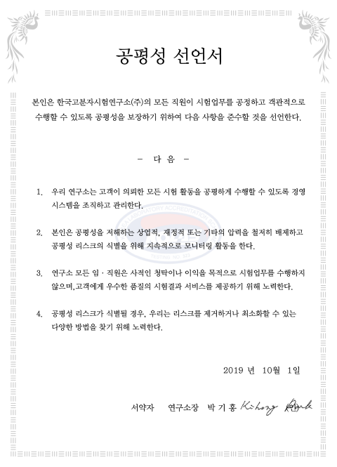 한국고분자시험연구소(주)는 모든 직원이 시험업무를 공정하고 객관적으로 수행할 수 있도록 공평성을 보장하기 위하여 다음 사항을 준수할 것을 선언합니다.