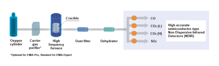 시료는 고주파 유도장치로(약 2000 ℃)에서 연소가스인 산소를 이용하여 연소과정을 거쳐 각각 CO2, SO2가스가 됩니다. 가스 내 수분과 Dust를 제거한 후, 적외선 검출 Cell에서 C, S 원소의 함량을 ppm~% 단위로 정량할 수 있습니다.