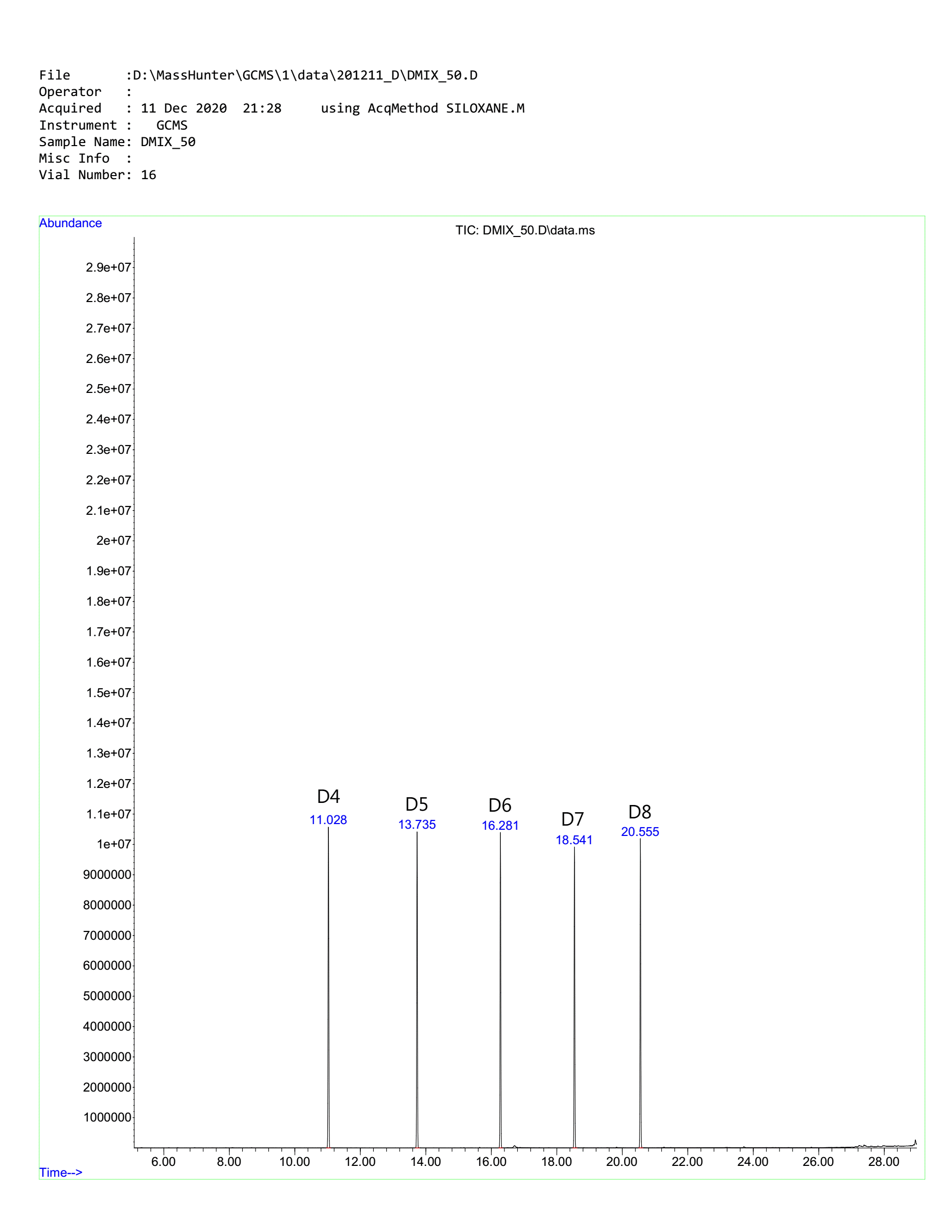 저분자 실록산의 분석 결과 GC-MS Chromatogram