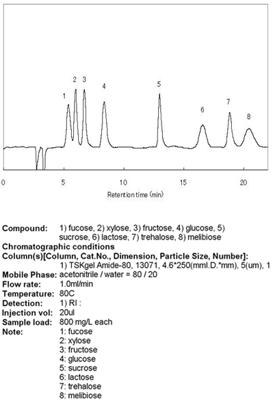 Amide-80컬럼을 이용한 단당과 이당의 분석예 (RI검출)