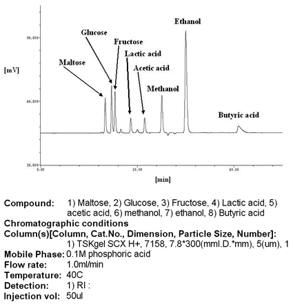 이온교환컬럼(SCX H+)을 이용한 유기산, 당, 알콜분석예 (RI검출)