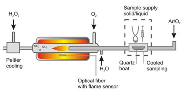 할로겐 원소(F, Cl, Br, I)를 포함한 시료는 아르곤 기체/산소기체가 있는 환경에서 연소되고 기화됩니다. 연소시스템을 직접 지나가며 불꽃센서로 인해 최적화된 연소시간이 적용됩니다. 기화된 HX, X2 기체가 흡수액인 과산화수소수 용액과 만나면 X- 이온형태로 존재하게 되며, 이 용액이 IC Column으로 전달되어 이온형태로 검출되게 됩니다.