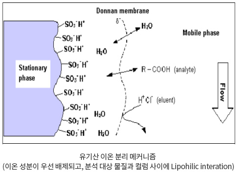 유기산 이온 크로마토그래피는 크로마토그래피의 다양한 분석 방식 중 이온배제(Ion exclusion) 방법을 통해 이온성을 띄지 않는 고정상(column)에 시료를 주입하면 시료 내에 이온성분들은 Functional Group과 반응하지 못하고 컬럼을 지나오며 이온성을 띄지 않는 성분(유기산)만 컬럼에서 반응 후 분리되게 됩니다. 컬럼 내부에서 반응 후 마지막 전기전도도 검출기에서 검출하는 단계에서만 음전하를 띄게 되어 검출됩니다.