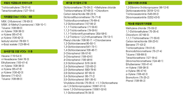 | 폐기물관리법 | 사업장 폐기물 중 폐유기용제ㆍ폐유 등 주변환경을 오염시키거나 인체에 피해를 줄 수 있는 유해한 물질을 “지정폐기물”로 정하여 관리하고 있다. 지정폐기물은 폐 유기용제 등 10개 항목으로 분류하며 폐유기용제는 테트라클로르에틸렌 등 할로겐족화합물 15개 항목과 벤젠 등 43개 항목으로 분류한다. |