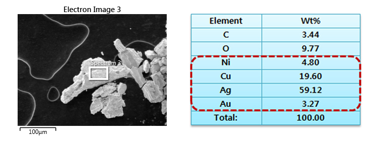 금속 단자 표면 이물질분석결과 Ag (Silver), Cu (Copper)로 이루어진 무기물로 확인됨.