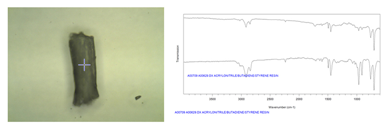 제약 내 이물질분석결과 ABS (Acrylonitrile butadiene styrene)로 확인됨.