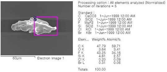 이물질분석결과 불소계 수지 분말로 분석됨.