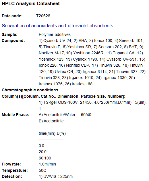 폴리올레핀을 포함한 대부분의 플라스틱은 이러한 첨가제를 필수적으로 사용하도록 되어있고, 이것들이 정말 함유되어 있는지 얼마나 함유되어 있는지, 성적서를 요구받기도 하기 때문입니다. 하지만 이 첨가제 정성분석은 생각만큼 간단하지는 않습니다. 고분자로부터 첨가제를 용출시키고, 각 첨가제 성분들이 chromatogram상에서 겹치지 않도록 조건을 설정해야 합니다. 또한, 함유된 첨가제 표준물질로부터 미리 검량곡선을 만들어 놓아야 합니다. Koptri 에서는 기본적으로 HPLC(PDA, ELSD detection) 혹은 GC/MS를 이용하여 첨가제 분석을 합니다. 분석하는 첨가제는 주로, BHT, Irganox series(245, 1010, 1035, 1076, 1330, 3114), Irgafos 168, Ultranox 626, Tinuvin series(326, 327, 328, 384, 440, 622, 770, 1130), Chimassorb 944, Cyasorb UV1164, Oleamide 등 입니다. 단, 이러한 성분분석을 위해서는 원칙적으로는 특정성분분석으로만 가능하며, 해당하는 첨가제물질을 표준물질(기준물질, 참조물질)로 소량 제공하여 주셔야 합니다. 내용성분을 전혀 모르는 상태에서 첨가제성분을 분석해야 하는 경우는, 문의시 따로 말씀해주시기 바랍니다. 이 경우는, 미지성분분석이 되어서, 최선성분분석으로만 서비스합니다. ‘간편 상담문의’ 또는 ‘분석신청 바로가기’를 통해 접수해주시면, 담당연구원으로부터 빠르고 정확한 답변을 받아보실 수 있습니다.
