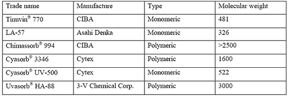 ㆍUV흡수제: TINUVIN234 TINUVIN326 TINUVIN327 TINUVIN328 TINUVIN329 TINUVIN360 TINUVIN571 TINUVIN1577 TINUVIN P UVINUL3035 UVINUL3039 Chimassorb81 ㆍHALS: TINUVIN123 TINUVIN622 TINUVIN765 TINUVIN770 UVINUL4050H UVINUL5050H STAB-LA57 STAB-LA62 Cyasorb UV3853 Cyasorb UV3080 UV 2908 |