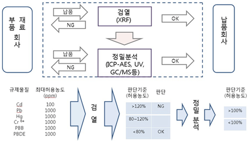 | 중금속 | 납(Pb), 수은(Hg), 카드뮴(Cd) | 전처리 ICP(정밀분석) XRF(유해물질Screening) |