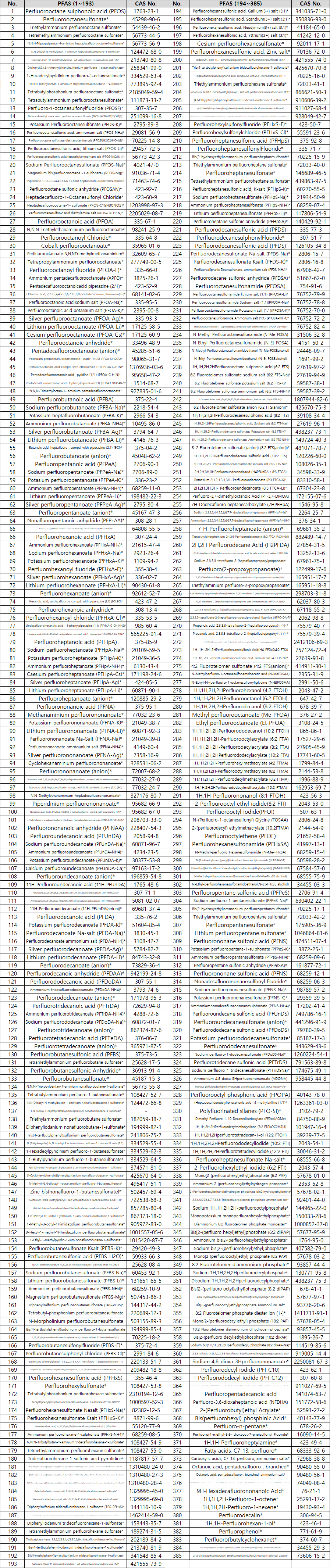 저희 연구소는 국제공인시험기관이지만, 유해물질 관련의 경우 KOPTRI와 협약된 전문공인시험기관으로 대행하여 서비스 (분석컨설팅) 하고 있습니다. 과불화화합물 분석은 PFOS 및 PFOA 포함 최대 385종 서비스 가능하오며, 물질 정보는 아래 표 참고해 주시기 바랍니다.