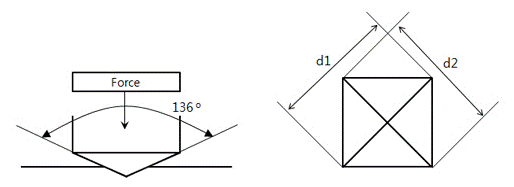 • 피라미드 모양의 압자를 이용하여 시편의 표면에 하중을 가한 다음, 시편의 표면에 생긴 자국(압흔)의 표면적을 계산하여 경도를 산출합니다. 압자가 피라미드 모양이기 때문에 아래 그림과 같이 시편의 표면에 사각형의 자국이 생기게 됩니다. 측정자가 현미경을 통해 사각형의 모서리 부분을 지정해 주면, 측정기는 대각선 길이를 읽어 표면적을 비커스 경도값으로 환산합니다.