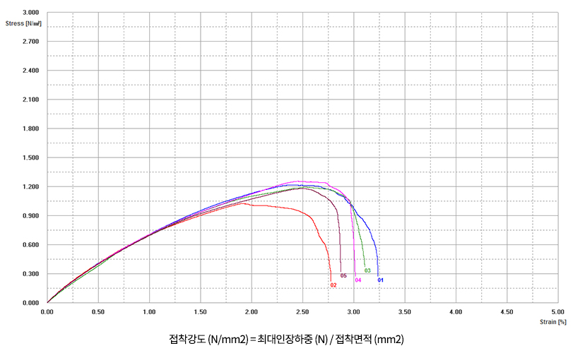 접착강도는 접착력(한번 붙였다 떼어낼 수 없는 정도의 강도)에 대한 시험 방법으로, 단위 면적당 발생하는 하중을 평가합니다.